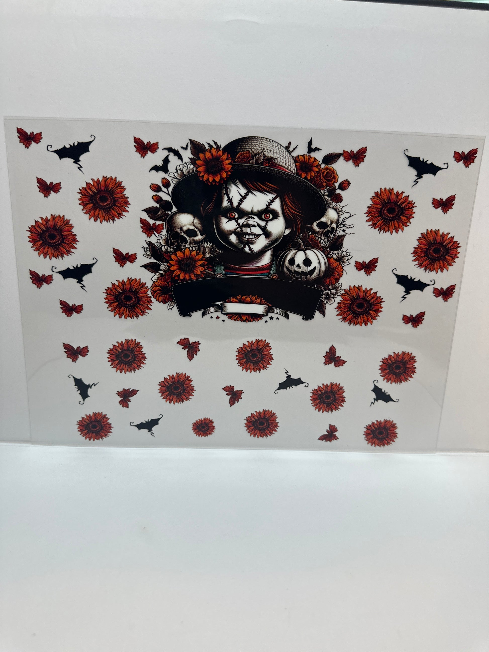 F775 Chucky Halloween with sunflowers and bats 40 ounce cup wrap